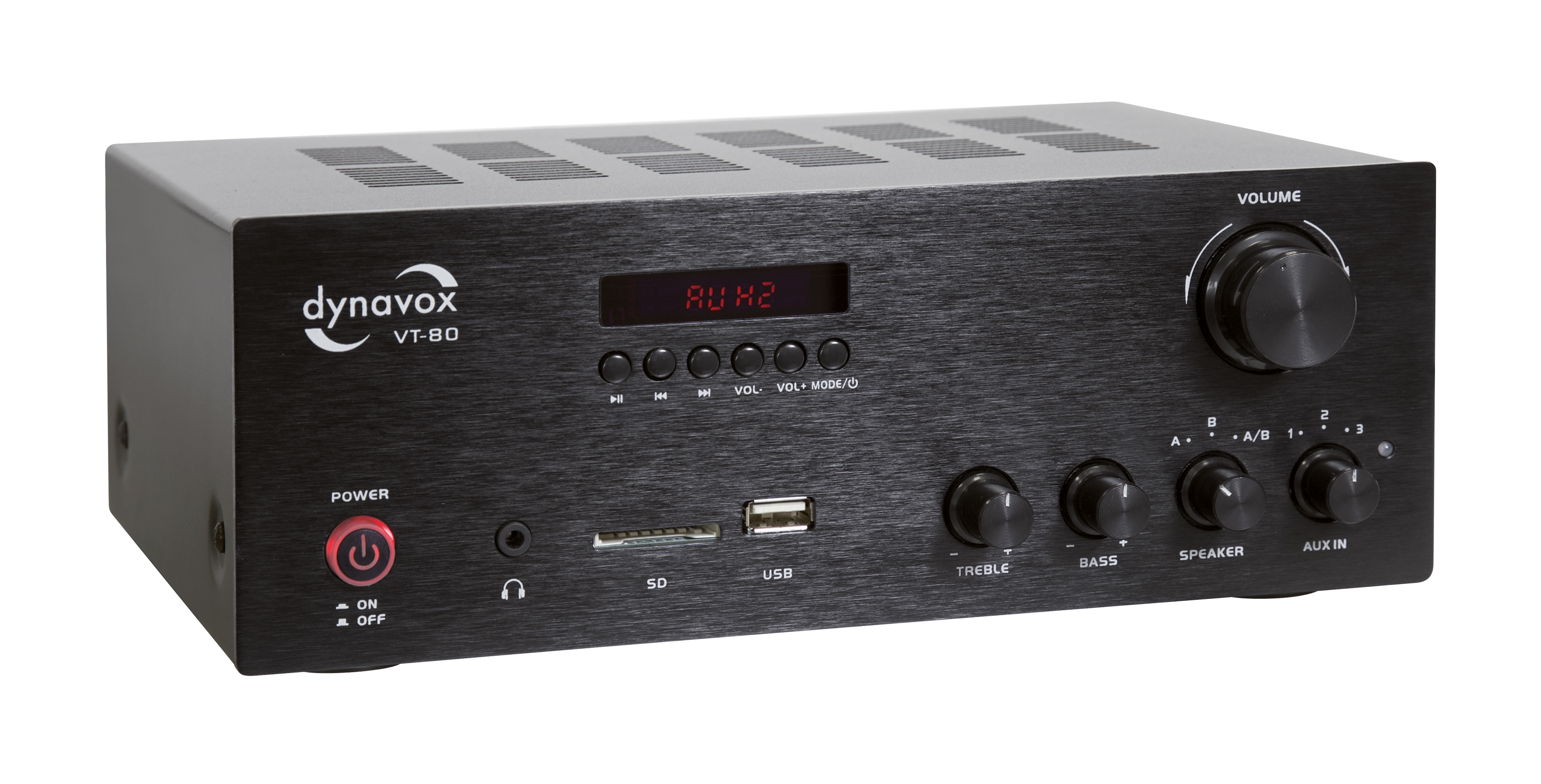 Der Dynavox VT-80 ist ein hochwertig verarbeiteter Stereo-Kompaktverstärker zum Anschluss von zwei analogen Eingangsquellen (Cinch), sowie für digitale Eingangssignale (SD/ USB und BT [V5.0]). Mit dem VT-80 haben Sie die Möglichkeit 2 Lautsprecher-Paare anzuschließen, die sich entweder Paarweise umschalten oder gleichzeitig betreiben lassen. Dadurch eignet er sich bestens zur Beschallung eines zweiten Raumes, einer Terrasse, etc. Außerdem verfügt der VT-80 über einen geregelten, vorverstärkten Signalausgang (Pre-Out), um eine weitere Endstufe oder einen Aktiv-Subwoofer zu betreiben, eine 2-Band Klangregelung und über eine Fernbedienung, zum steuern der digitalen Signal-Eingänge. Die geringen Geräteabmessungen machen den VT-80 zum platzsparenden Verstärker für eine kleine bis mittlere Stereoanlage. Für einen gleichzeitigen Betrieb aller 4 Lautsprecher-Anschlüsse, werden Lautsprecher-Boxen mit einer Impedanz zwischen 8 - 16 Ohm benötigt! Online-Test der i-fidelity.net UVP: 219 €; Technische Daten: Typ: Vollverstärker; Frequenzbereich: 20 Hz - 20 kHz (± 3 dB); Leistung: (Musik / 4 Ohm) 160 W; Eingangsempfindlichkeit: 220 mV (1 kHz/ THD 1%); Signal-Rauschabstand: 83 dB; Ausgangsimpedanz: 4-8 Ohm; Verzerrung: 0,3 %; Eingänge: 2x Stereo Cinch-Buchse, SD und USB, BT; Ausgänge: Bananen-Schraubklemmen, Pre-out (Stereo Cinch), 3,5 mm Kopfhörer-Klinkenbuchse; Unterstützte Formate: (USB / SD) MP3,WAV und WMA; Betriebsspannung: 230 V (AC) / 50Hz; Farbe: schwarz; Maße: B x H x T 250 x 95 x 180 mm; Auto-Standby: Ja; Leistungsaufnahme im AUS-Zustand: < 0,4 W; Leistungsaufnahme im Standby-Zustand: < 0,4 W; Vernetzter Bereitschaftsbetrieb: Nein; Dauer bis Autostandby: 15 Minuten; Gewicht: 2,9 kg